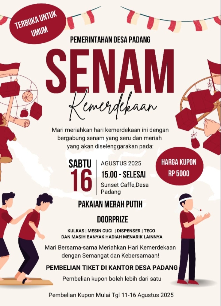 Cukup beli kupon seharga Rp5.000 di Kantor Desa Padang (11–16 Agustus). Nggak beli kupon? Tenang, tetap boleh ikut meramaikan!